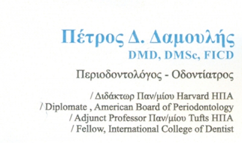 Ο Δρ. Πέτρος Δαμουλής είναι πτυχιούχος της Φαρμακευτικής και Οδοντιατρικής Σχολής του Πανεπιστημίου Αθηνών. Ειδικεύτηκε στην Περιοδοντολογία στο Πανεπιστήμιο Tufts και κατόπιν ολοκλήρωσε το διδακτορικό του στο Πανεπιστήμιο Harvard της Βοστώνης των Η.Π.Α., στον τομέα της Βιολογίας Στόματος. Είναι επίσης πτυχιούχος της Οδοντιατρικής Σχολής του Πανεπιστημίου Tufts και Διπλωματούχος του American Board of Periodontology.Έχει πάρει πολλά βραβεία και διακρίσεις. Ήταν αριστούχος της Οδοντιατρικής Σχολής του Πανεπιστημίου Αθηνών, υπότροφος του Ιδρύματος Κρατικών Υποτροφιών και του Ιδρύματος «Αλέξανδρος Σ. Ωνάσης». Έχει λάβει το Προεδρικό Βραβείο του Πανεπιστημίου Tufts για εξαιρετική επίδοση στα διδακτικά και διοικητικά καθήκοντα και είναι επίτιμο μέλος του Διεθνούς Κολλεγίου Οδοντιάτρων.Έχει διατελέσει Επιμελητής στην Οδοντιατρική Σχολή του Πανεπιστημίου Harvard, Επίκουρος Καθηγητής στην Οδοντιατρική Σχολή του Πανεπιστημίου της Νέας Υόρκης, Αναπληρωτής Καθηγητής στην Οδοντιατρική Σχολή του Πανεπιστημίου Tufts και μετέπειτα Καθηγητής και Διευθυντής Μεταπτυχιακών Σπουδών στο ίδιο Πανεπιστήμιο. Έχει άδεια εξάσκησης οδοντιατρικού επαγγέλματος στην Ελλάδα και στη Μασαχουσέτη των Η.Π.Α.