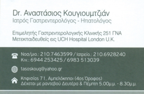 Αναπλ. Διευθυντής γαστρεντερολογικής κλινικής 251 ΓΝΑ, μετεκπαιδευθείς εις UCH HOSPITAL LONDON UK. Δέχεται Δευτέρα & Πέμπτη 17:00-20:30 με ραντεβού.