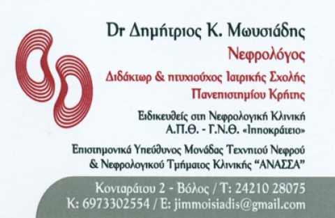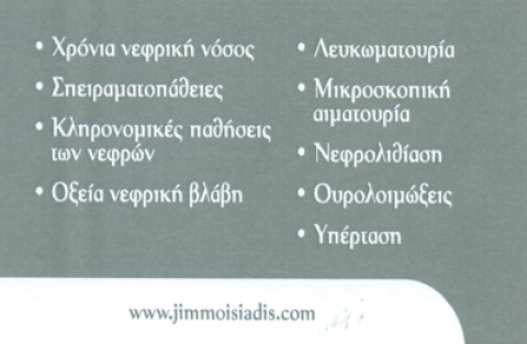 Οξεία και χρόνια νεφρική ανεπάρκεια, σπειραματονεφρίδια, λευκωματουργία, αιματουργία, νεφρολιθίαση, υπέρταση.Δέχεται με ραντεβού.