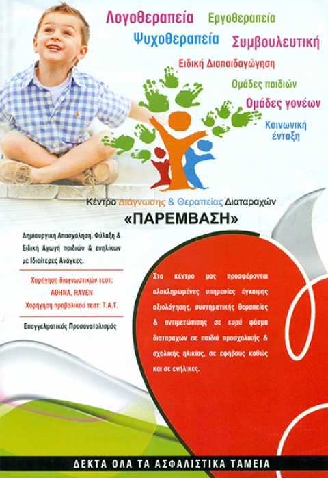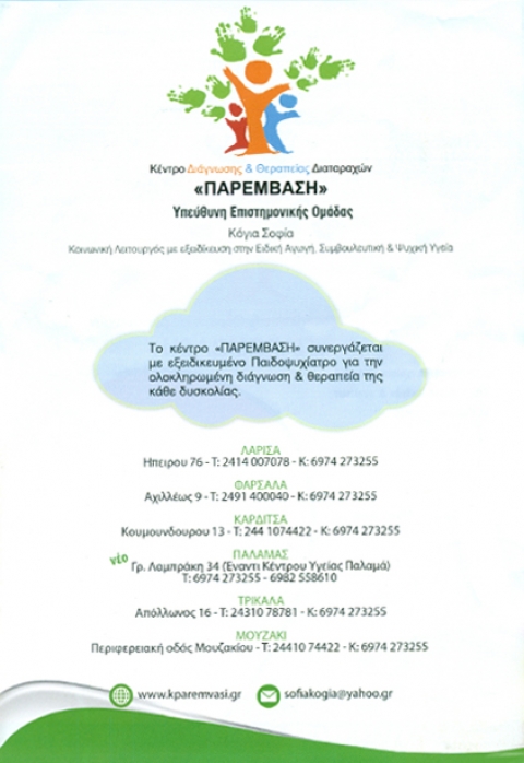 Το Κέντρο Διάγνωσης και Θεραπείας Διαταραχών Η Παρέμβαση με έδρα στην Καρδίτσα παρέχει ένα εύρος υπηρεσιών αξιολόγησης, θεραπείας και αντιμετώπισης των διαταραχών λόγου – ομιλίας – φωνής (λογοθεραπεία), κίνησης, συμπεριφοράς και μάθησης σε παιδιά προσχολικής και σχολικής ηλικίας, σε εφήβους και σε ενήλικες. Το Κέντρο είναι στελεχωμένο με επιστήμονες όλων των ειδικοτήτων.