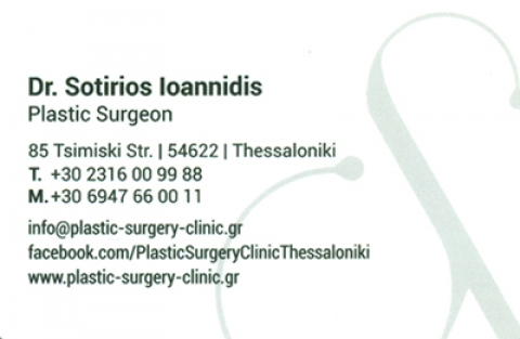 Το ιατρείο PLASTIC SURGERY CLINIC - ΙΩΑΝΝΙΔΗΣ ΣΩΤΗΡΙΟΣ, με πλαστικό χειρουργό τον κύριο Ιωαννίδη Σωτήριο, εδρεύει στη Θεσσαλονίκη και παρέχει υπηρεσίες αισθητικής και επανορθωτικής πλαστικής χειρουργικής.