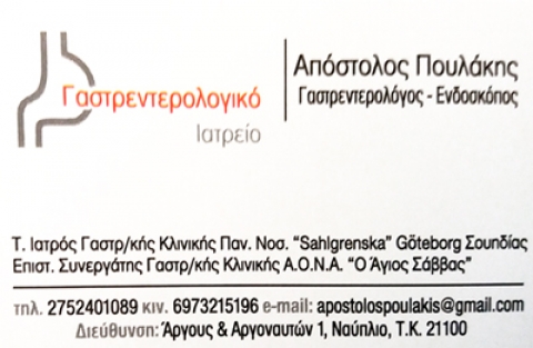 Γαστροσκόπηση - ενδοσκόπηση - κολονοσκόπηση, πολύποδεςΔέχεται καθημερινά πρωί 09:00 - 15:30 με ραντεβού